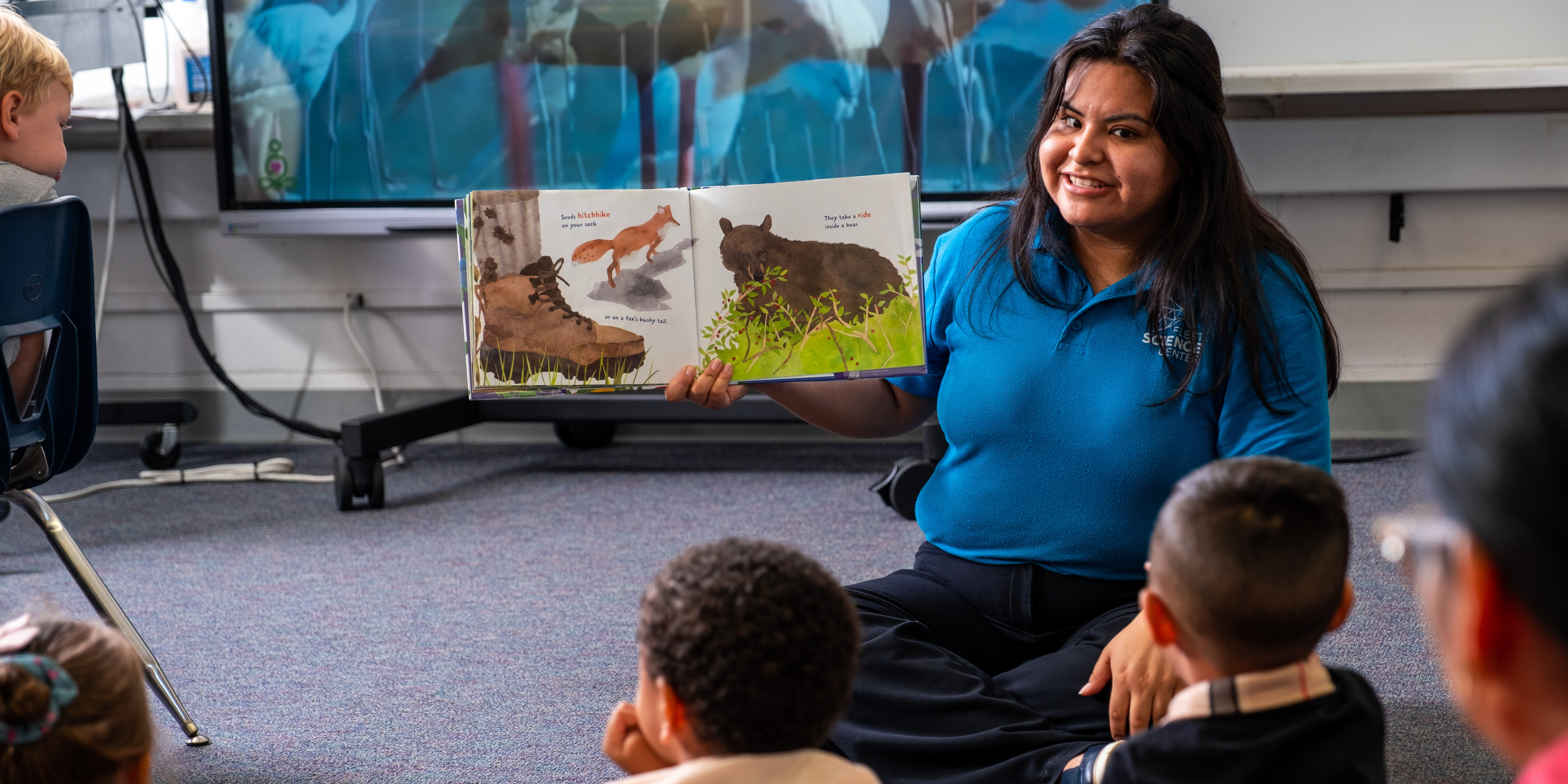 (Above image) Fleet educator Daniela Sanchez Cruz begins every session by reading a science-themed story, reinforcing that science and literacy skills are complementary.